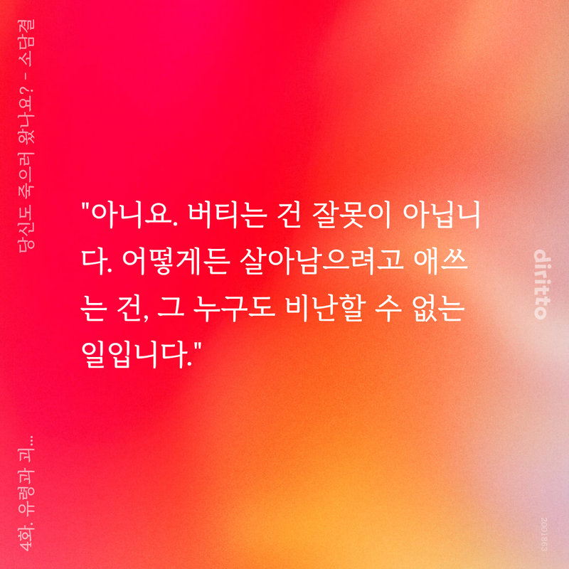 ※ 본 작품은 생생한 캐릭터 묘사를 위해 사투리를 일부 사용해 의도적으로 맞춤법을 지키지 않은 대사가 있습니다. 또한, 작중에 가정폭력, 따돌림을 묘사하고 있어 이용에 참고 바랍니다.